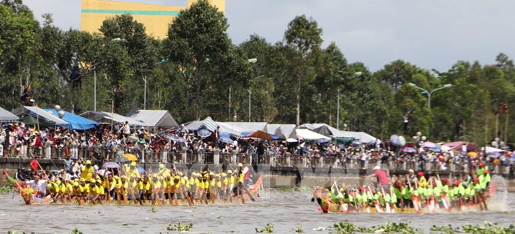 Các trận thi đấu quyết liệt tạo nên sức hấp dẫn của môn đua ghe Ngo. Ảnh: Hồng Thái - TTXVN