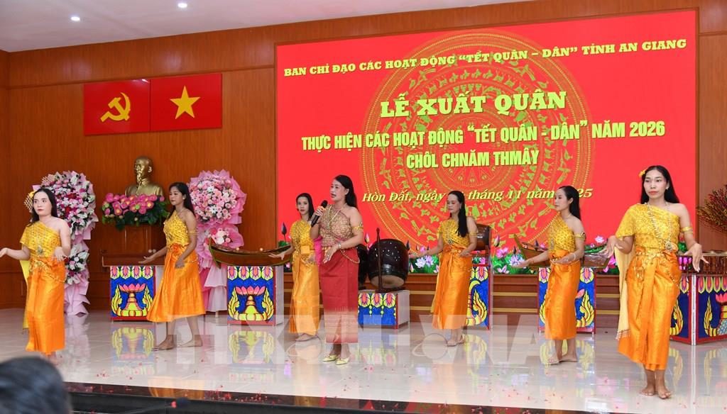 Tiết mục văn nghệ tại lễ xuất quân thực hiện các hoạt động "Tết Quân - Dân" năm 2026 mừng Chôl Chnăm Thmây. Ảnh: Văn Sĩ - TTXVN
