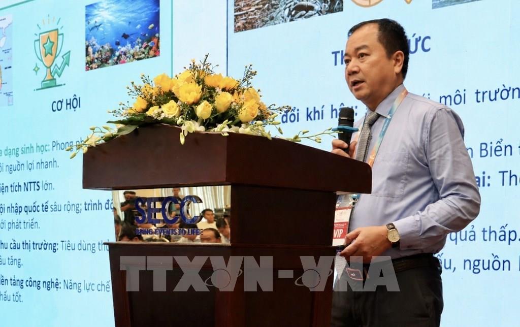 Ông Trần Đình Luân, Cục trưởng Cục Thuỷ sản và Kiểm ngư, Bộ Nông nghiệp và Môi trường thông tin tổng quan ngành thuỷ sản tại hội nghị. Ảnh: Xuân Anh - TTXVN