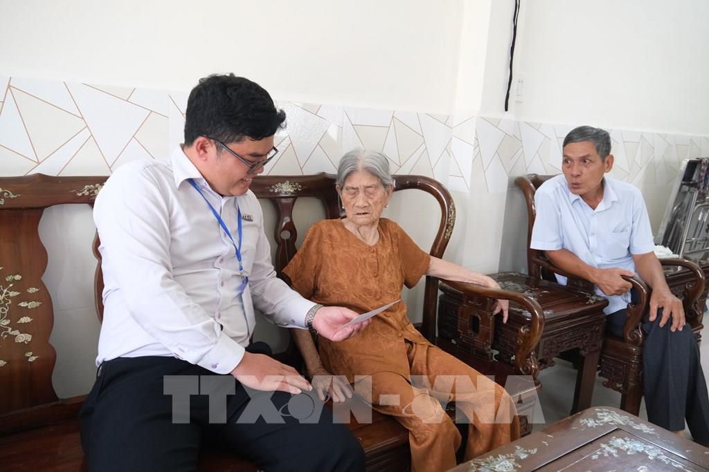 Cụ Vũ Thị Còm trò chuyện với phóng viên Nguyễn Thanh Liêm, Thông tấn xã Việt Nam về kỳ vọng đối với đại biểu Quốc hội khóa XVI và HĐND các cấp. Ảnh: Hồng Thái - TTXVN