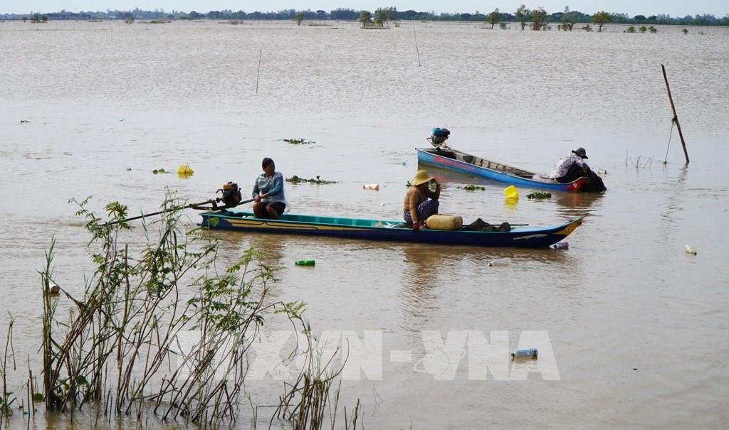 Người dân chài cá trên cánh đồng ngập nước thuộc phường Thường Lạc (tỉnh Đồng Tháp) vào cuối mùa lũ. Ảnh: Nhựt An - TTXVN
