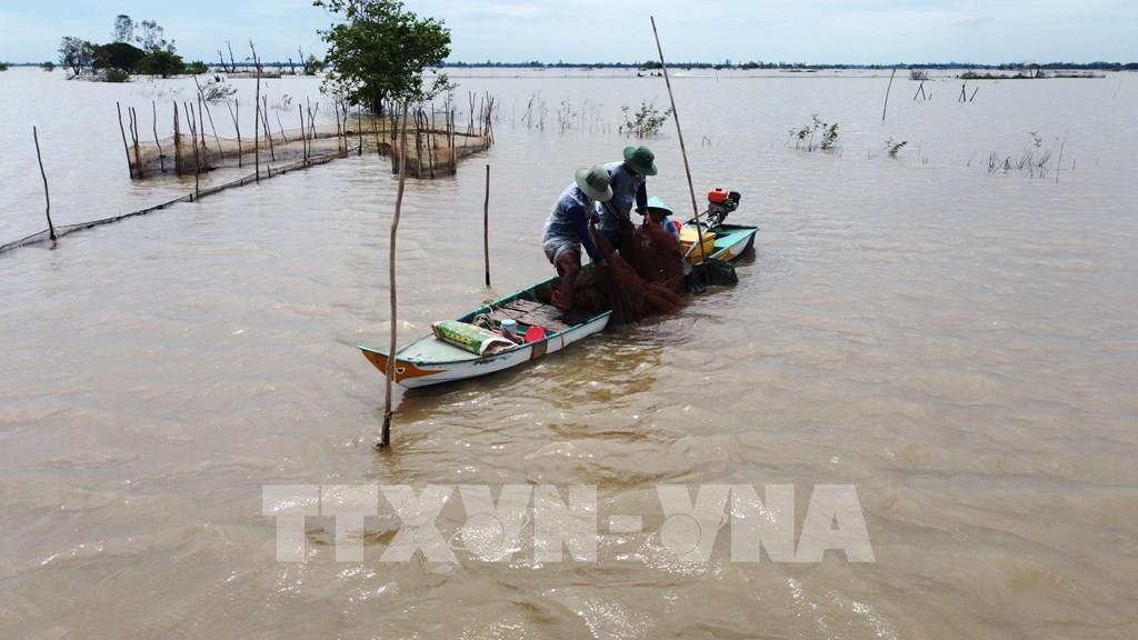 Nước lũ rút là thời điểm đánh bắt thủy sản nhộn nhịp của người dân ở khu vực đầu nguồn tỉnh Đồng Tháp. Ảnh: Nhựt An - TTXVN