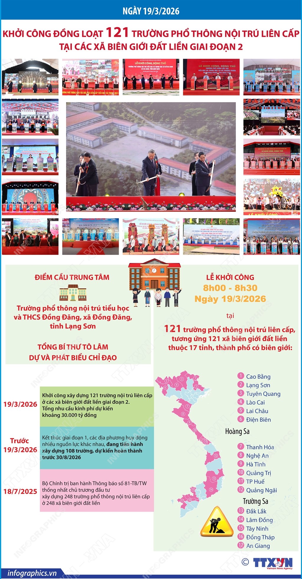 Khởi công đồng loạt 121 trường phổ thông nội trú liên cấp tại các xã biên giới đất liền giai đoạn 2. Nguồn: Infographics.vn