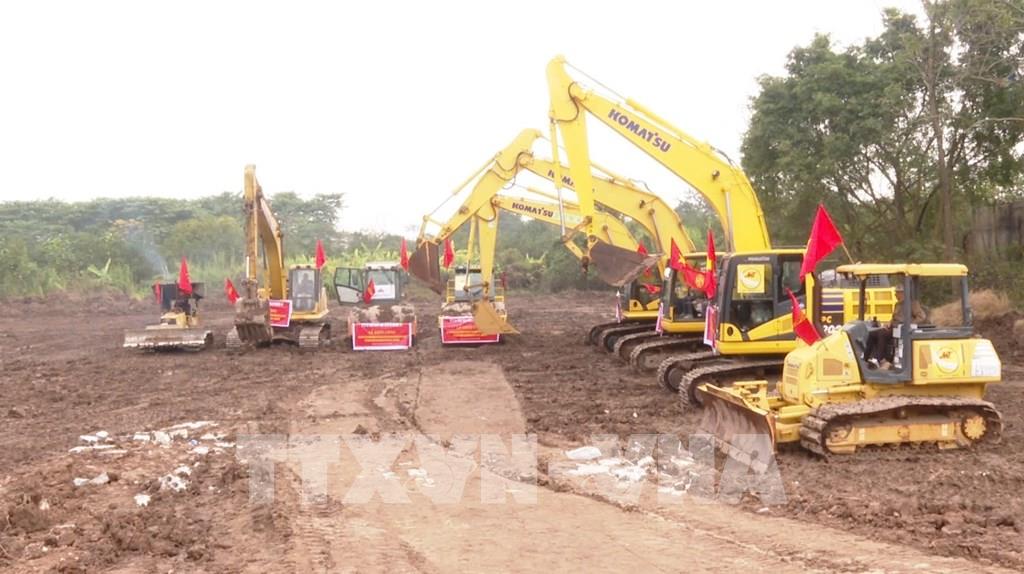 Các phương tiện tập kết tại công trường thi công tuyến đường kết nối cầu Tứ Liên (từ nút giao cầu Tứ Liên với đường Trường Sa) đến đường cao tốc Hà Nội – Thái Nguyên. Ảnh: TTXVN