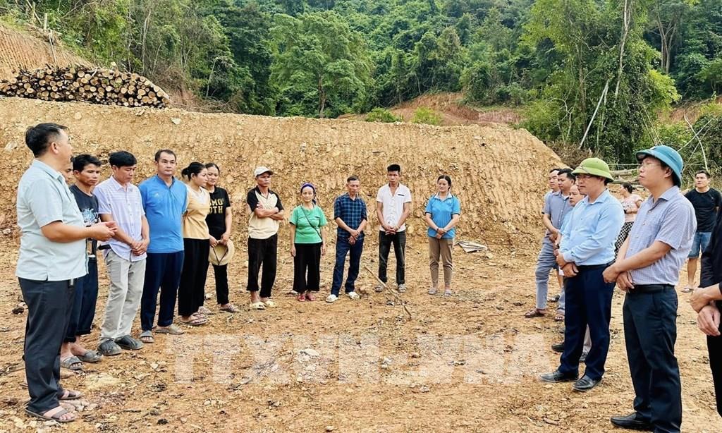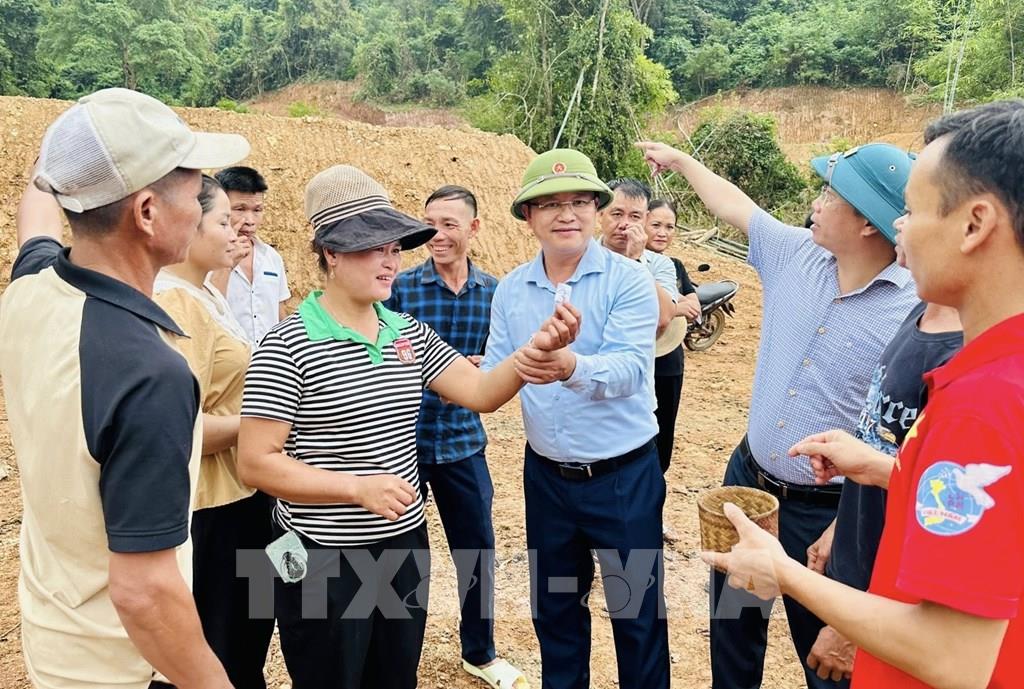 Cấp ủy, chính quyền địa phương và các ban ngành, ngành đoàn thể xã Nhôn Mai (tỉnh Nghệ An) tổ chức bốc thăm, bàn giao mặt bằng tái định cư cho 35 hộ gia đình có nhà cửa bị cuốn trôi nhà do lũ dữ. Ảnh: TTXVN phát