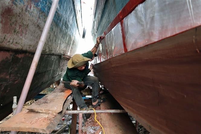 Tàu GL45863 của ông Nguyễn Hổ Sơn, xã Đề Gi, tỉnh Gia Lai, đã nhanh chóng hoàn thành sửa chữa để đánh bắt chuyến đầu tiên. Ảnh: Kha Phạm – TTXVN
