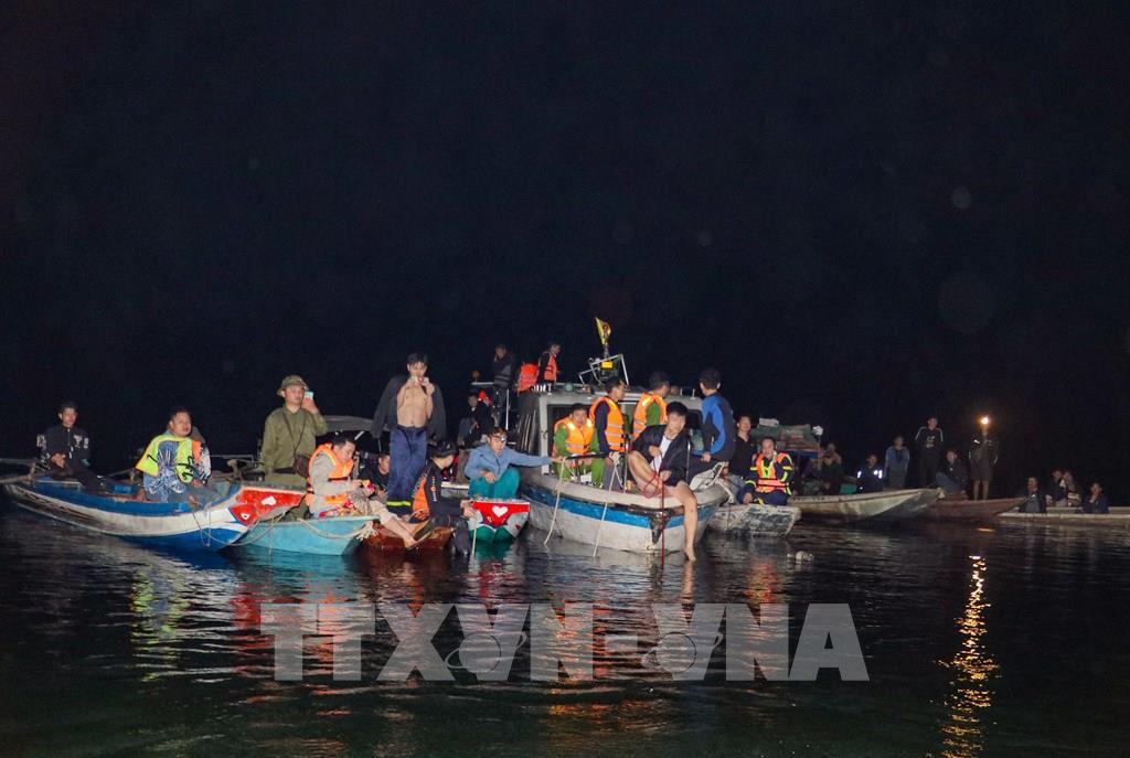 Các lực lượng xuyên đêm tìm kiếm các nạn nhân mất tích trong vụ lật tàu trên hồ Thác Bà. Ảnh: Tuấn Anh - TTXVN