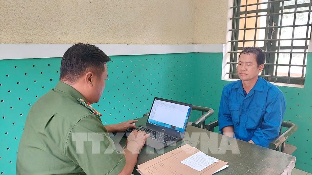 Lực lượng công an làm việc với bị can Nguyễn Việt Thanh. Ảnh: TTXVN phát