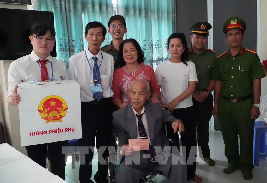 Tổ bầu cử số 1, phường Xuân Hòa, TP. Hồ Chí Minh tổ chức đưa thùng phiếu đến tận nhà hỗ trợ cử tri Phạm Ngọc Anh (sinh năm 1945) thực hiện quyền công dân. Ảnh: Hữu Duyên - TTXVN