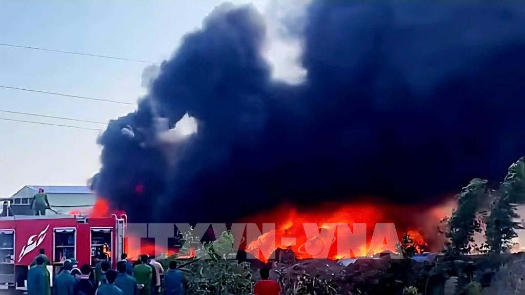 Lửa bùng phát dữ dội tại nhà xưởng bông của Chi nhánh Công ty TNHH Thương phẩm Á Phi (khu Hợp Thành, phường Yên Tử). Ảnh: TTXVN phát