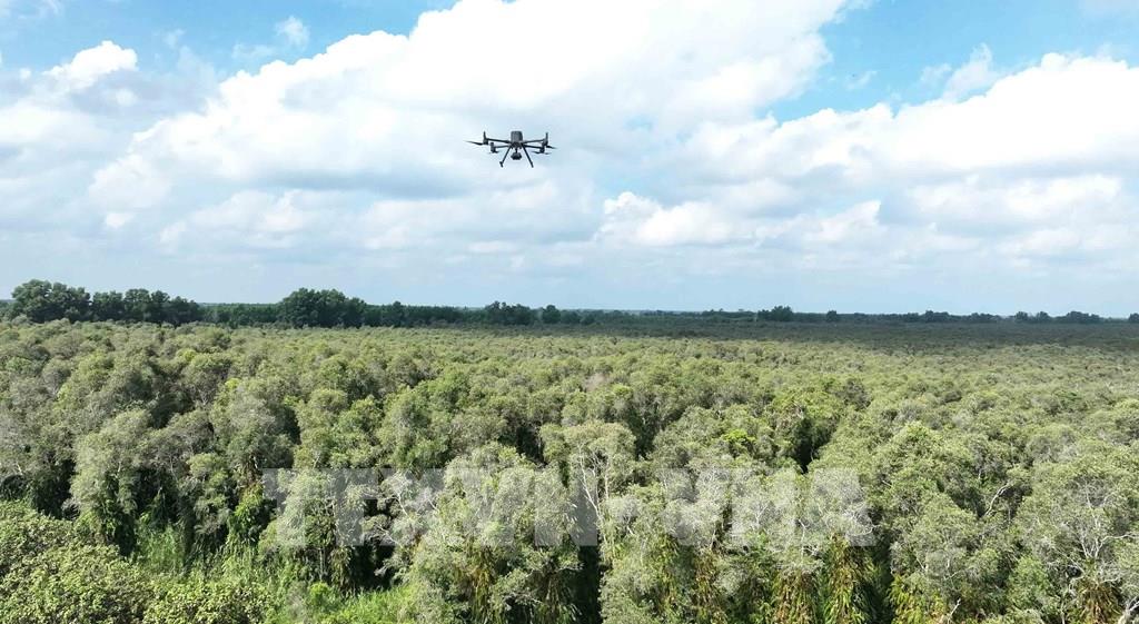 Lực lượng Kiểm lâm và lực lượng bảo vệ rừng sử dụng thiết bị bay không người lái (flycam) giám sát trong khu vực vườn quốc gia U Minh Hạ, tỉnh Cà Mau. Ảnh: Vũ Sinh – TTXVN