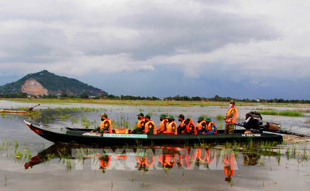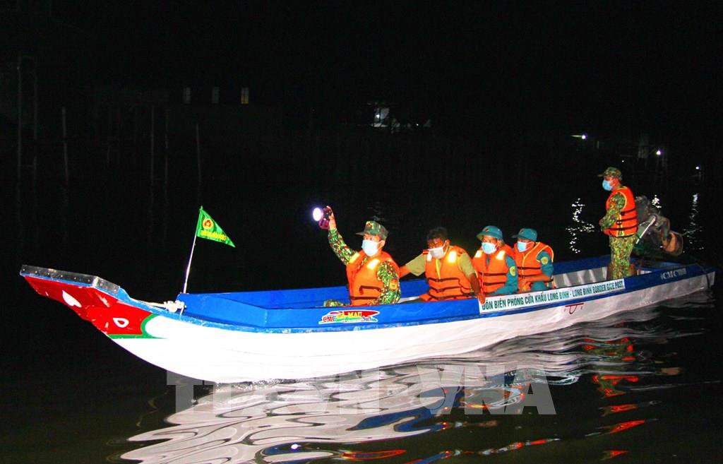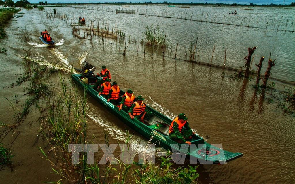 Cán bộ, chiến sĩ đồn Biên phòng của khẩu Long Bình (Ban Chỉ huy Bộ đội Biên phòng tỉnh An Giang) phối hợp các lực lượng tuần tra kiểm soát biên giới trong mùa nước nổi. Ảnh: Công Mạo-TTXVN