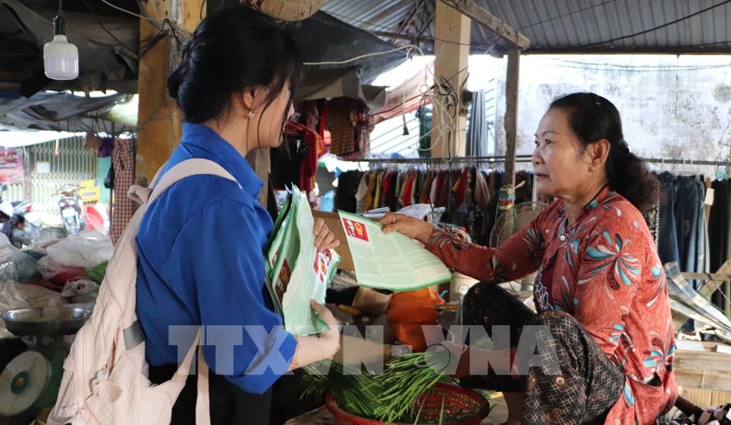 Đoàn viên, thanh niên xã Vĩnh Thuận Đông phát tờ rơi tuyên truyền về bầu cử tại chợ trung tâm xã. Ảnh: Hồng Thái - TTXVN