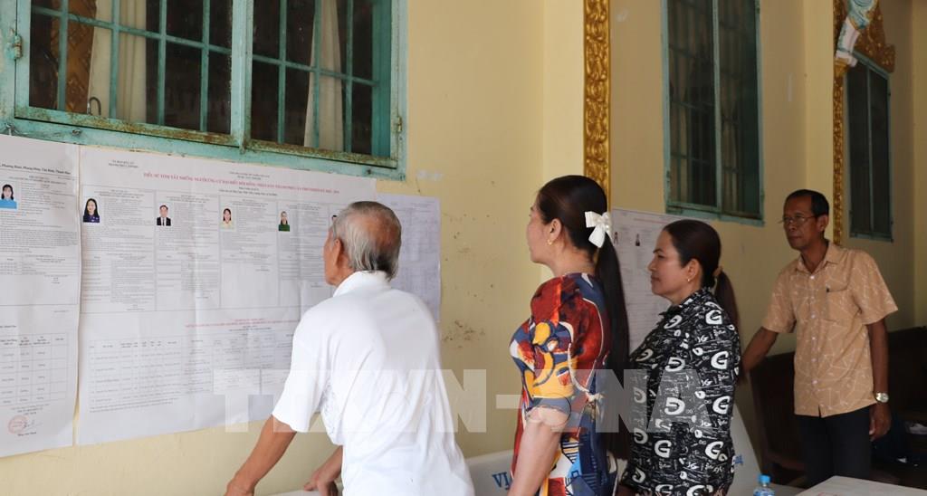 Đồng bào Khmer ấp Ngã Cạy, xã Xà Phiên tìm hiểu thông tin về ứng cử viên đại biểu Quốc hội và HĐND được niêm yết tại chùa Bôrâysarâychum. Ảnh: Hồng Thái - TTXVN