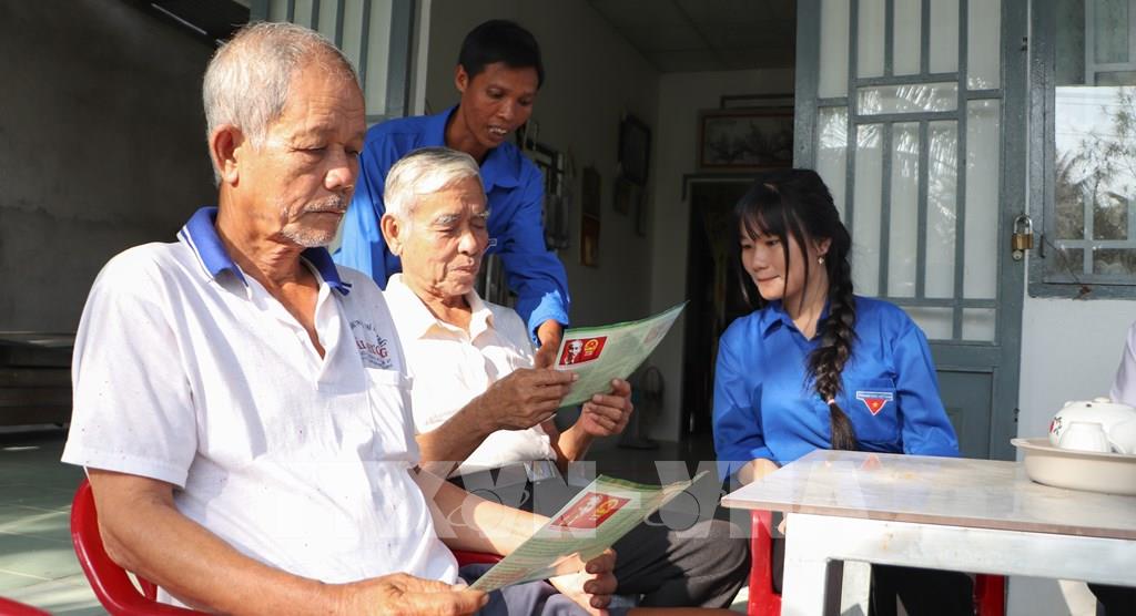 Đoàn viên, thanh niên xã Vĩnh Thuận Đông phổ biến thông tin bầu cử đến đồng bào Khmer ấp 6B. Ảnh: Hồng Thái - TTXVN