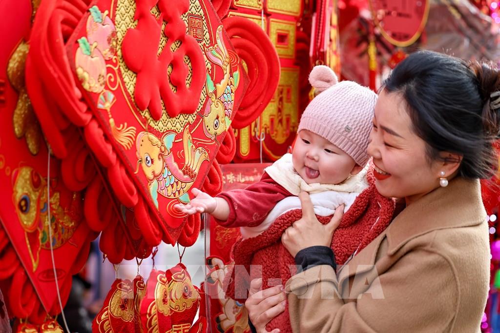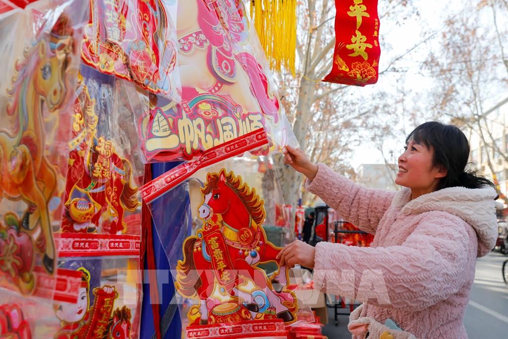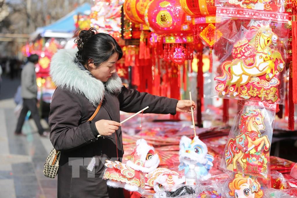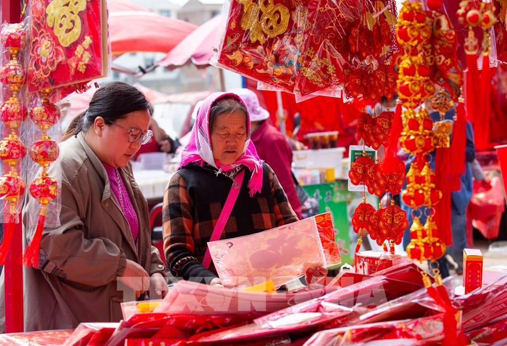 Người dân mua đồ trang trí Tết tại tỉnh Cam Túc, Trung Quốc. Ảnh: THX/TTXVN