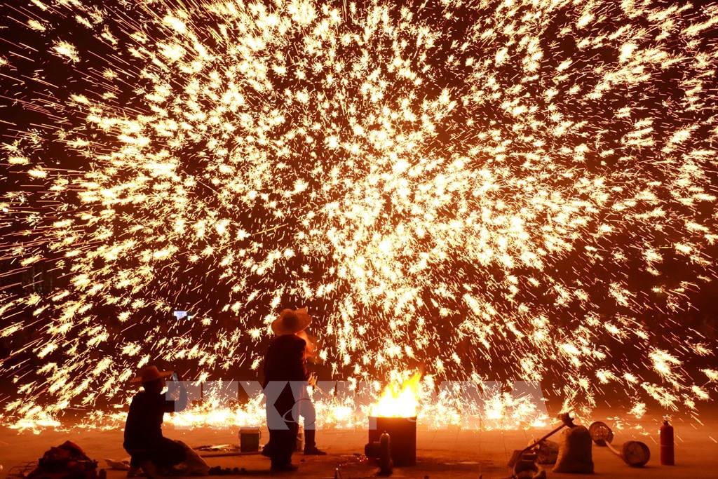 Biểu diễn đả thiết hoa (đánh hoa sắt) đón Tết Nguyên đán tại tỉnh Hà Nam, Trung Quốc. Ảnh: THX/TTXVN