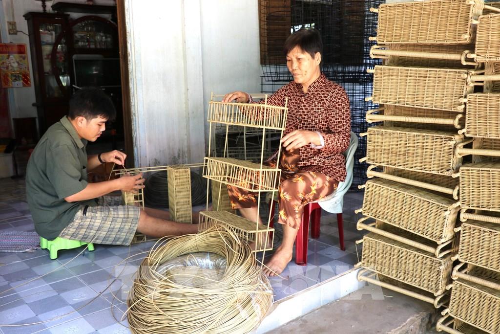 Người dân ấp Phú Thọ II, xã Tiểu Cần (Vĩnh Long) nhận gia công đan đát xuất khẩu. Ảnh: Thanh Hòa - TTXVN