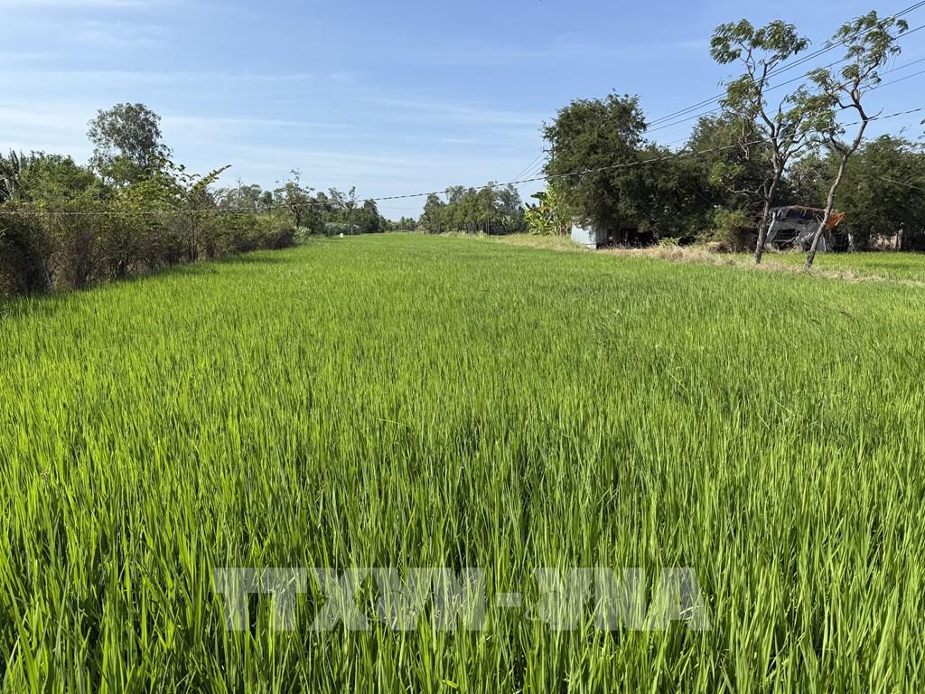Lúa Đông Xuân ở xã Tân Hòa, tỉnh Đồng Tháp chuẩn bị thu hoạch, không bị ảnh hưởng của hạn mặn. Ảnh: Công Trí-TTXVN
