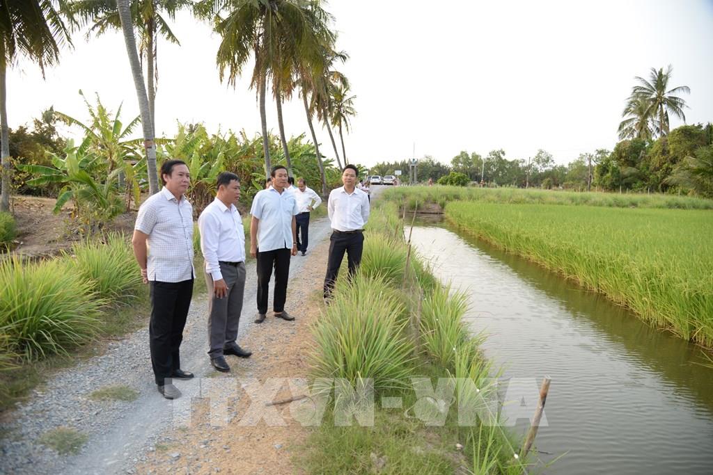 Lãnh đạo Sở Nông nghiệp và môi trường Đồng Tháp kiểm tra tình hình sản xuất nông nghiệp ở vùng ngọt hóa Gò Công, tỉnh Đồng Tháp. Ảnh: Công Trí-TTXVN