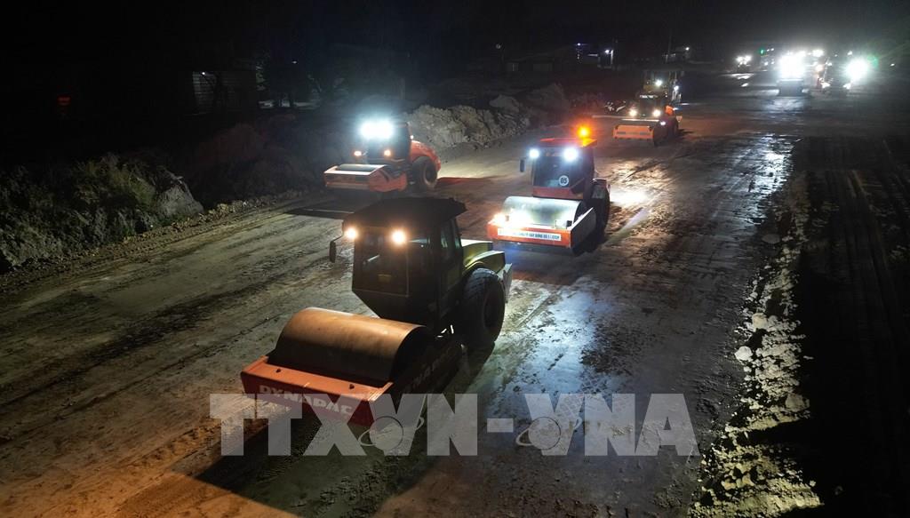 Thi công đêm nhằm đẩy nhanh tiến độ cao tốc Biên Hòa - Vũng Tàu, đoạn qua Đồng Nai. Ảnh: Công Phong - TTXVN
