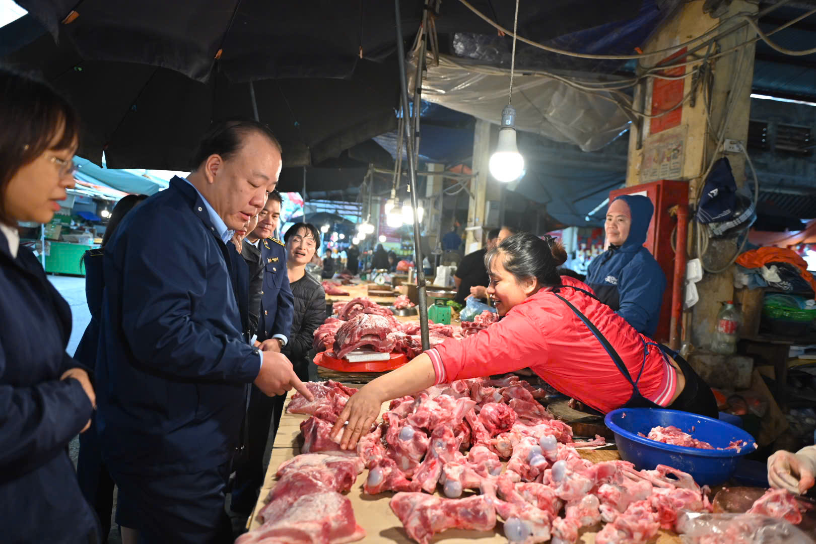 Đoàn khảo sát tại khu vực kinh doanh thịt lợn trong chợ Hà Đông. Ảnh: Bộ Công Thương