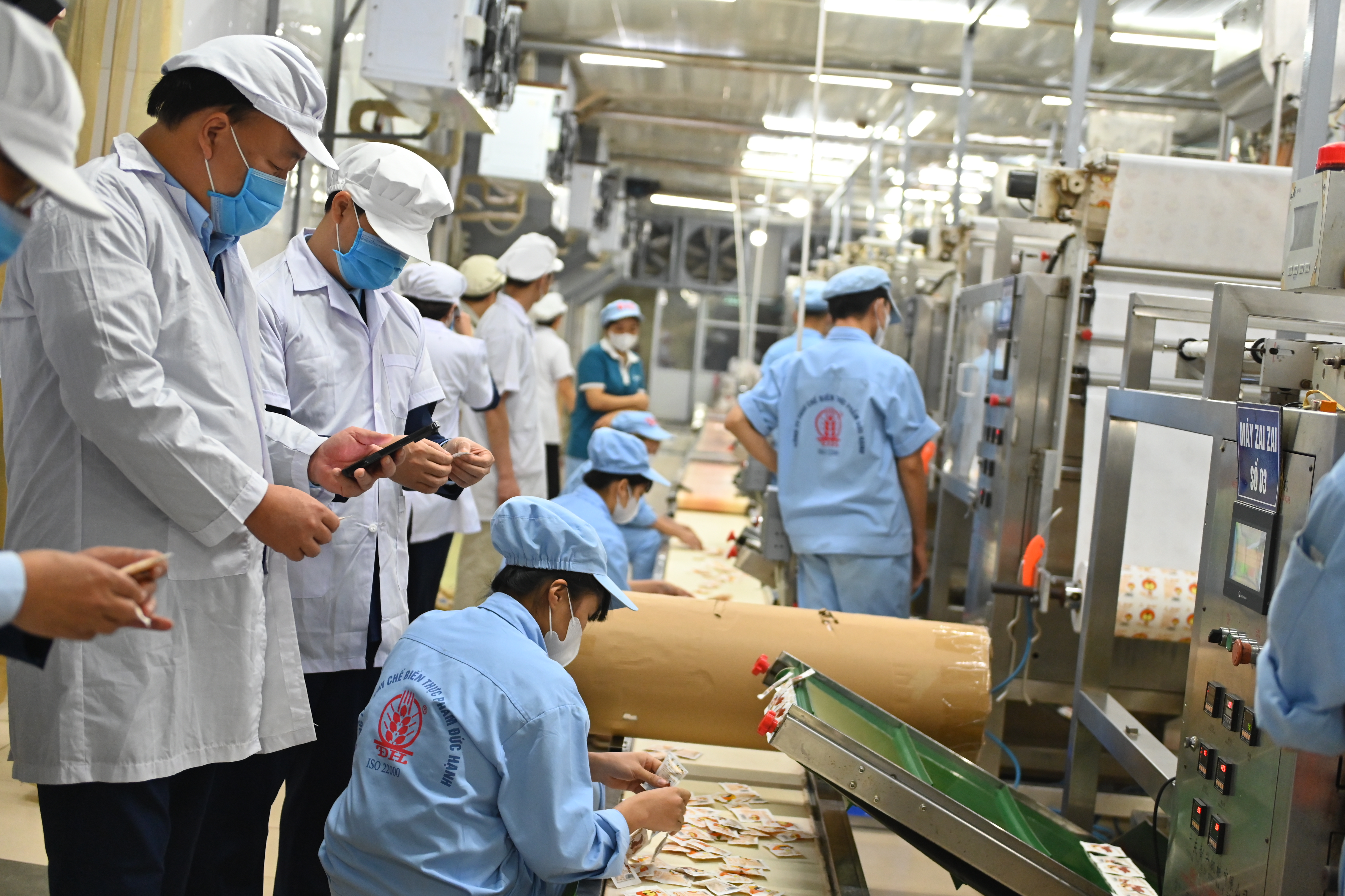 Đoàn khảo sát tình hình sản xuất, kinh doanh và khả năng cung ứng sản phẩm ra thị trường tại Công ty TNHH Chế biến thực phẩm Đức Hạnh. Ảnh: Bộ Công Thương