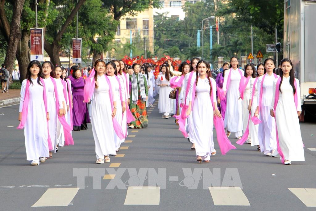 Đoàn diễu hành áo dài trình diễn tại lễ hội. Ảnh: Trung Kiên - TTXVN