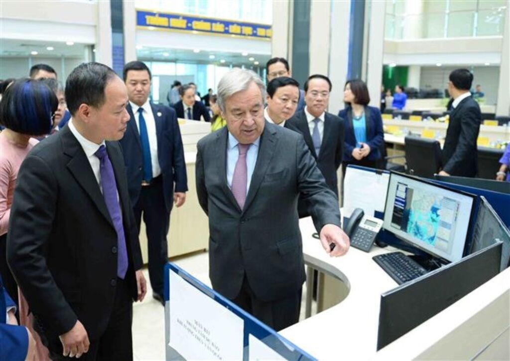 Tổng Thư ký Liên hợp quốc António Guterres xem hệ thống dự báo lũ quét, sạt lở đất cho khu vực Đông Nam Á tại Trung tâm tác nghiệp khí tượng thủy văn. Ảnh: Minh Đức/TTXVN