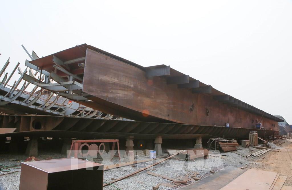 Thân tàu đóng mới đang trong quá trình vào khung sườn. Ảnh: Công Luật - TTXVN