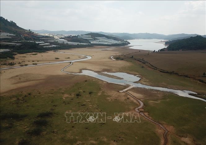 Hồ Đankia - Suối Vàng (huyện Lạc Dương, Lâm Đồng) cạn trơ đáy ở phía thượng nguồn gây ảnh hưởng đến hoạt động tưới tiêu và cấp nước sinh hoạt cho địa phương. Ảnh: Nguyễn Dũng – TXTVN