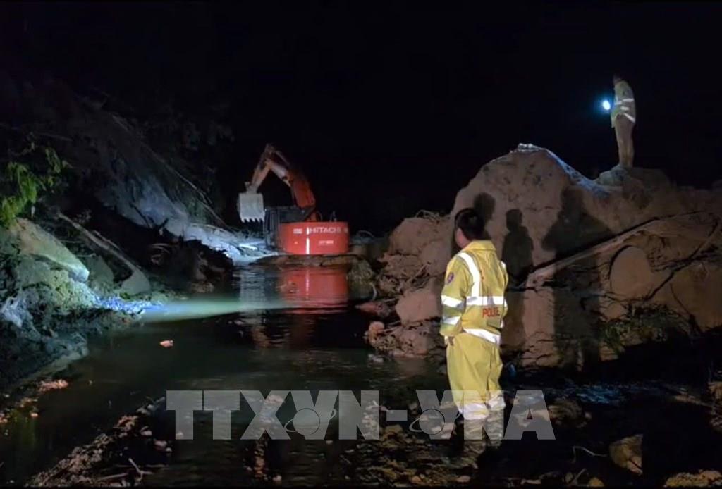 Lực lượng Cảnh sát giao thông Công an tỉnh Lâm Đồng phối hợp cùng các đơn vị khác khắc phục sạt lở, giải cứu lái xe và phương tiện bị mắc kẹt 2 ngày đêm trên đèo Khánh Lê. Ảnh: TTXVN phát