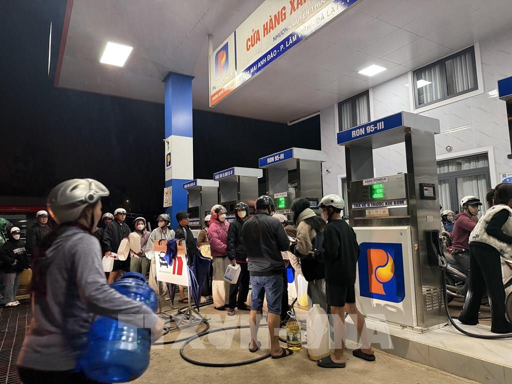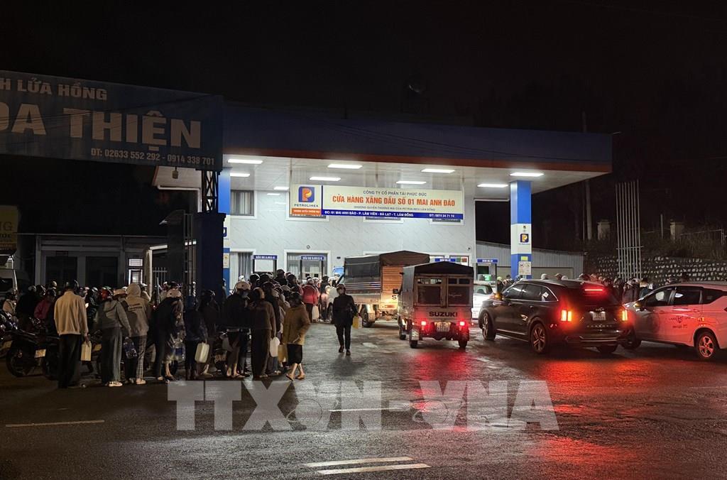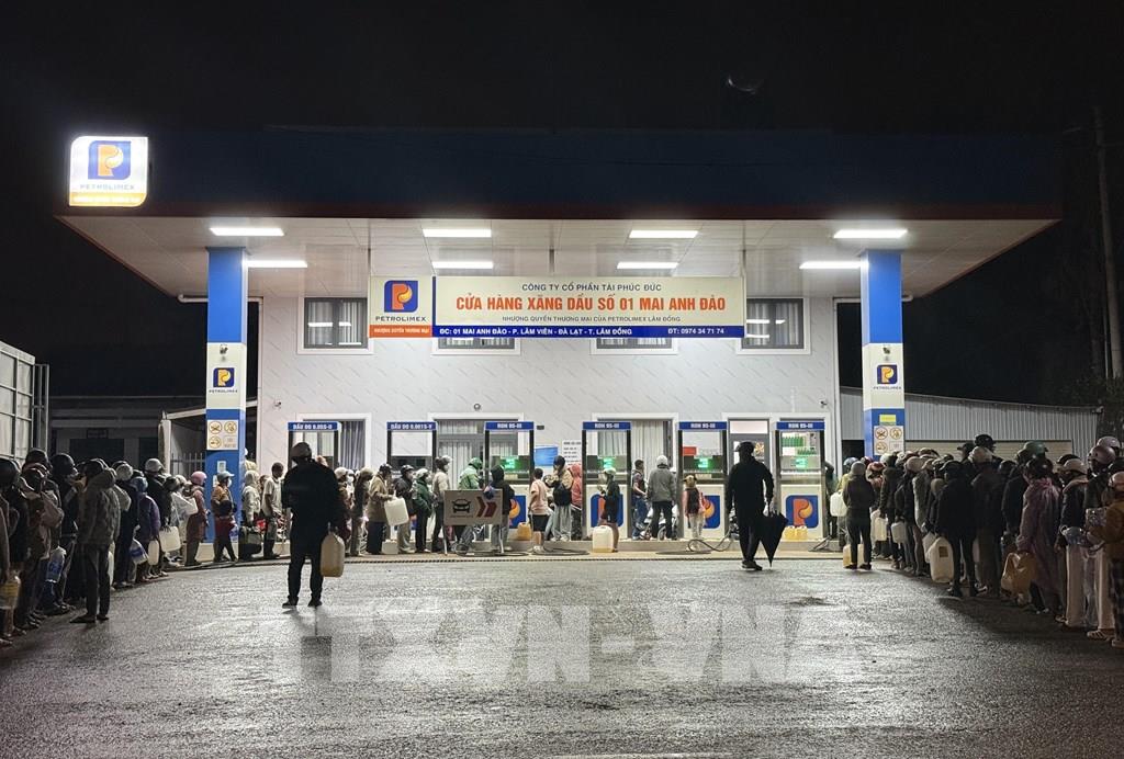 Hàng dài người dân xếp hàng chờ mua xăng dầu về tích trữ trước thông tin nguồn cung bị khan hiếm do cấm xe tải trên 3,5 tấn lên đèo Tà Nung. Ảnh: Nguyễn Dũng – TTXVN