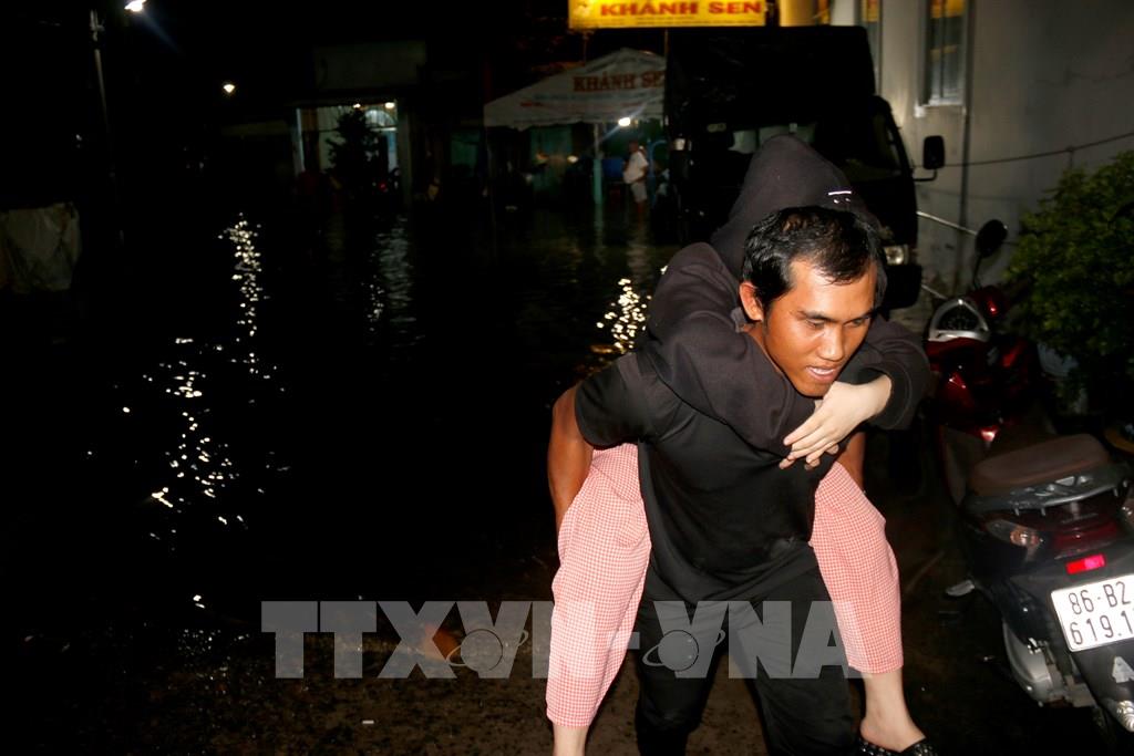 Người dân di chuyển khỏi khu vực ngập sâu đến nơi an toàn. Ảnh: Nguyễn Thanh - TTXVN