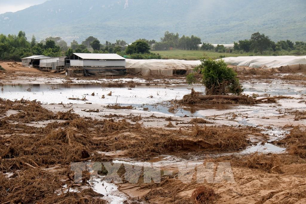 Trang trại chăn nuôi của người dân trên núi Tân Lai (xã Tuy Phong, Lâm Đồng) bị bùn đất lấp do vỡ hồ chứa vẫn chưa được khắc phục. Ảnh: Nguyễn Thanh - TTXVN