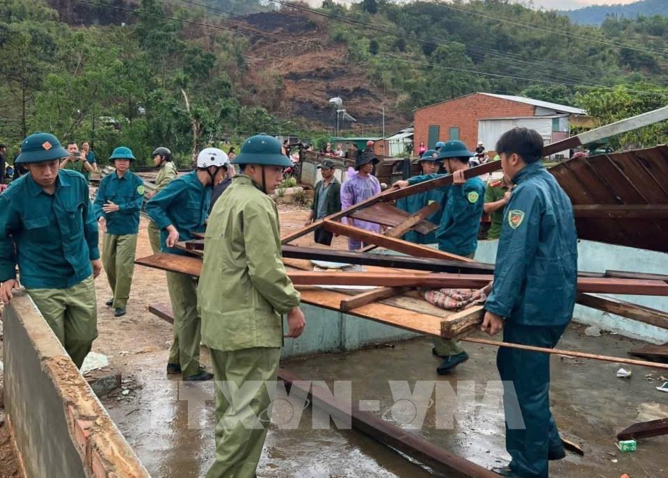 Lực lượng chức năng xã Đam Rông 2 được huy động hỗ trợ người dân khắc phục hậu quả, dọn dẹp nhà cửa sau trận giông lốc chiều 15/4. Ảnh: TTXVN phát