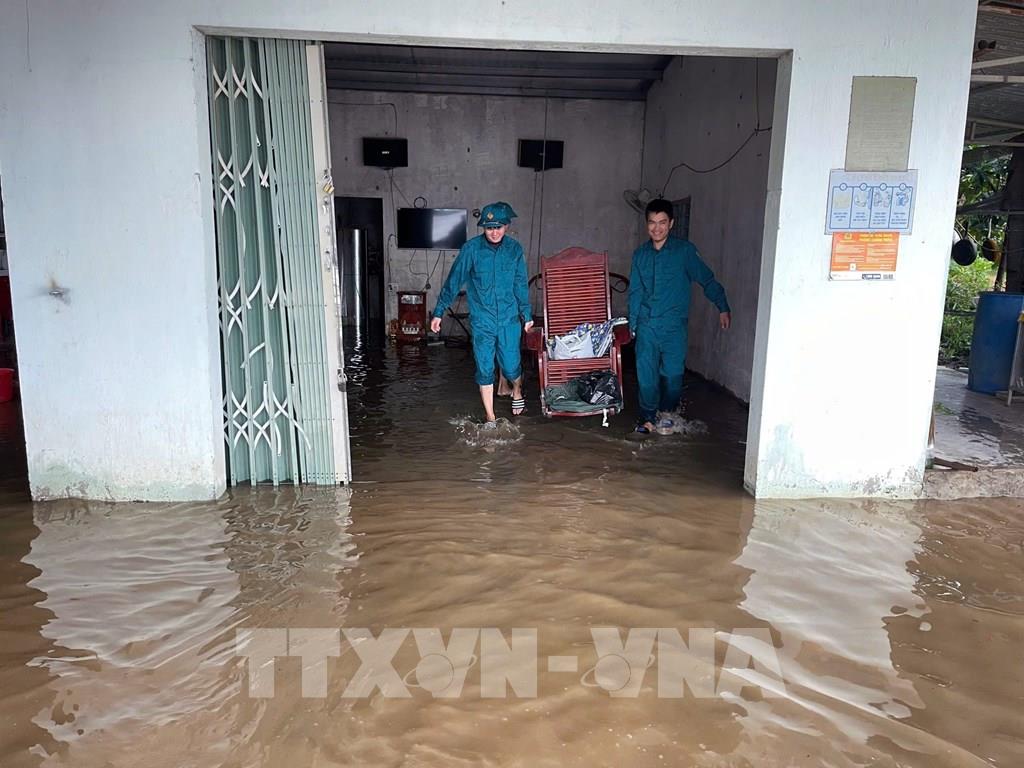Lực lượng dân quân hỗ trợ người dân di chuyển đồ đạc khỏi vùng ngập lụt ven sông Krông Nô, tỉnh Lâm Đồng. Ảnh: TTXVN phát