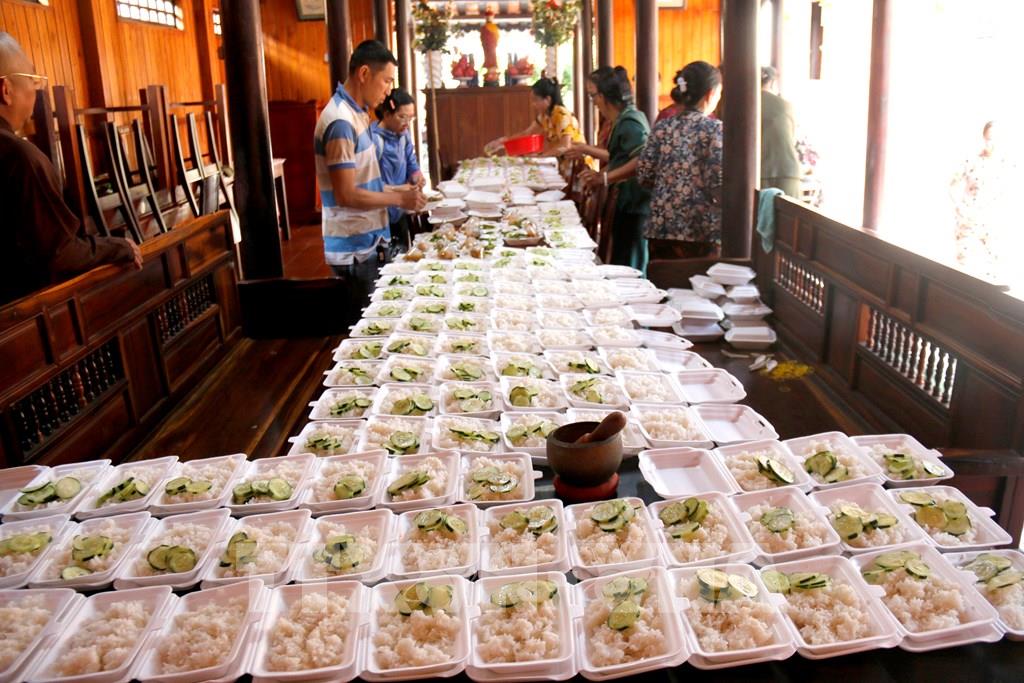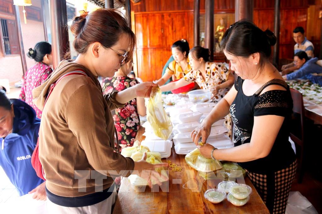 Các phật tử chùa An Lạc, phường Hàm Thắng (Lâm Đồng) chuẩn bị suất ăn cho các hộ dân đang bị chia cắt, ngập nặng. Ảnh: Nguyễn Thanh – TTXVN