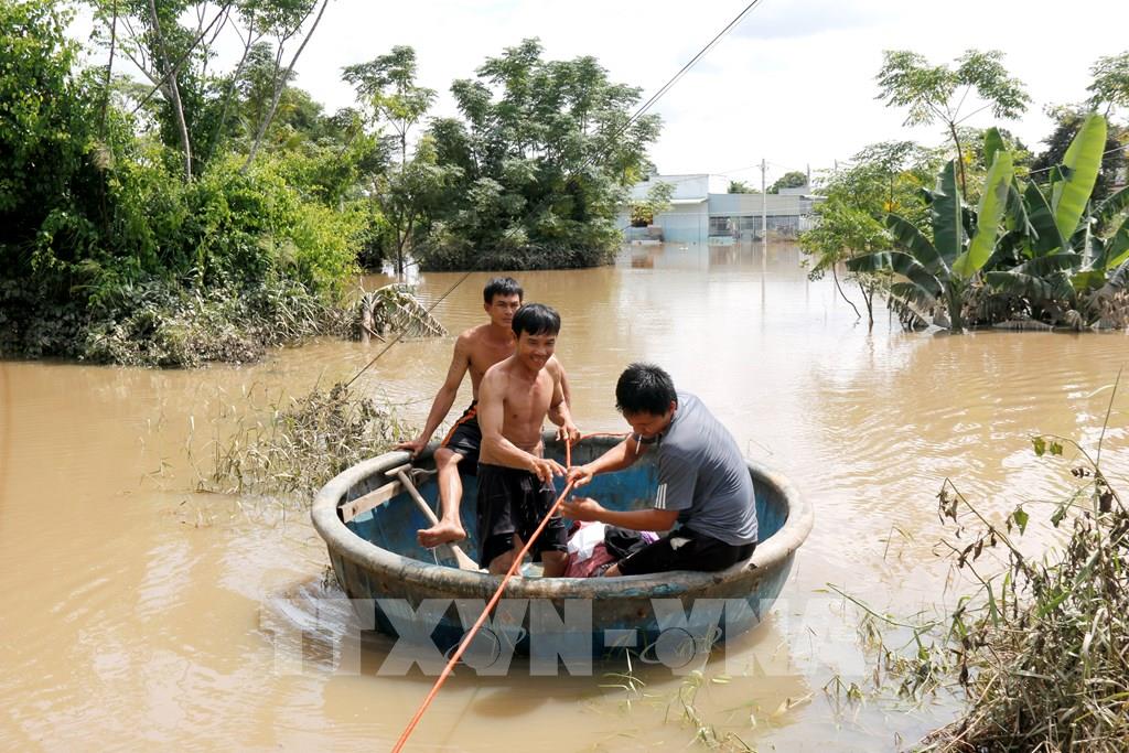 Nhiều hộ dân tại phường Hàm Thắng (Lâm Đồng) vẫn ngập sâu, người dân phải dùng thuyền thúng để di chuyển, nhận thức ăn. Ảnh: Nguyễn Thanh – TTXVN