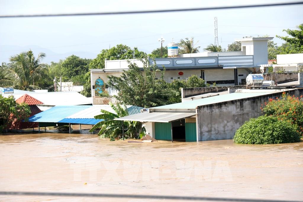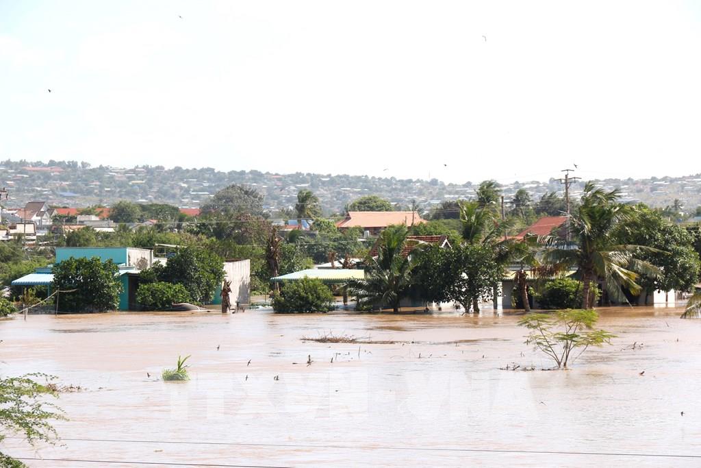 Nhiều nhà dân tại phường Hàm Thắng (Lâm Đồng) ngập sâu trong nước. Ảnh: Nguyễn Thanh - TTXVN