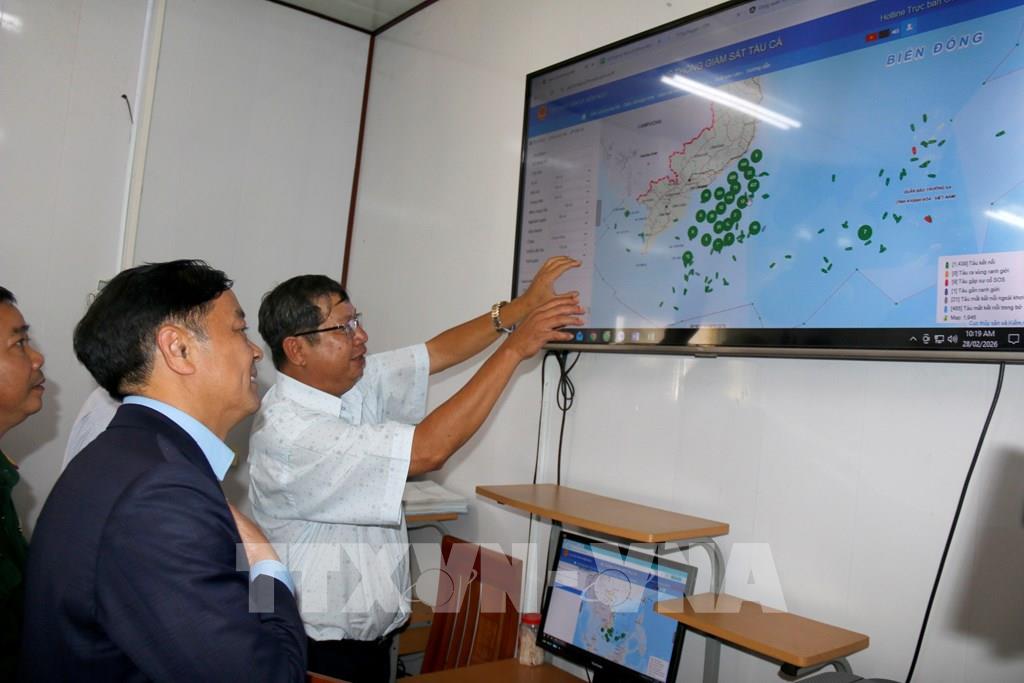 Lãnh đạo tỉnh Lâm Đồng theo dõi thông tin kiểm soát tàu cá hoạt động trên biển tại Trung tâm giám sát tàu cá tỉnh. Ảnh: Nguyễn Thanh - TTXVN