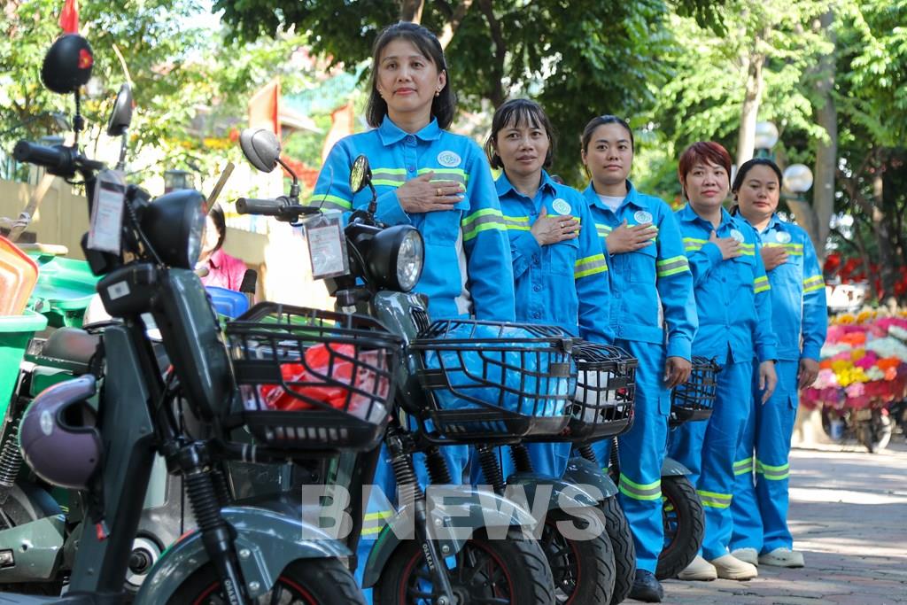 Công ty TNHH MTV Môi trường đô thị Hà Nội (Urenco) đã thay thế phương pháp thu gom thủ công bằng cách sử dụng xe điện 2 bánh vệ sinh chuyên dụng để làm sạch vỉa hè và đường phố. Ảnh: Đức Hạnh/Bnews/vnanet.vn