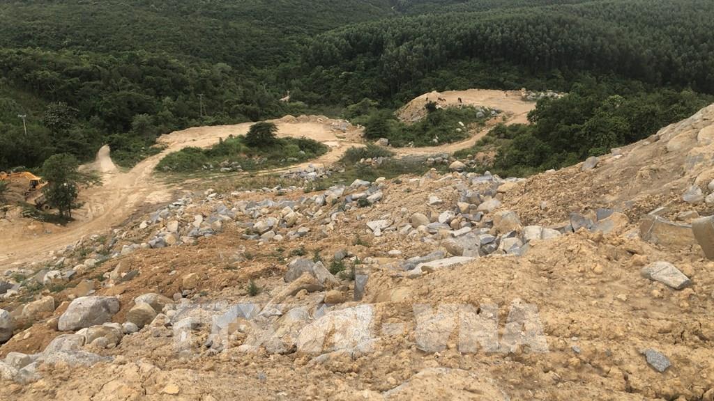 Ghi nhận của phóng viên tại khu vực mỏ đá cho thấy, lớp đất thực bì được cào bóc, nhiều khối đá lớn còn ngổn ngang, có những hố sâu ngập nước...