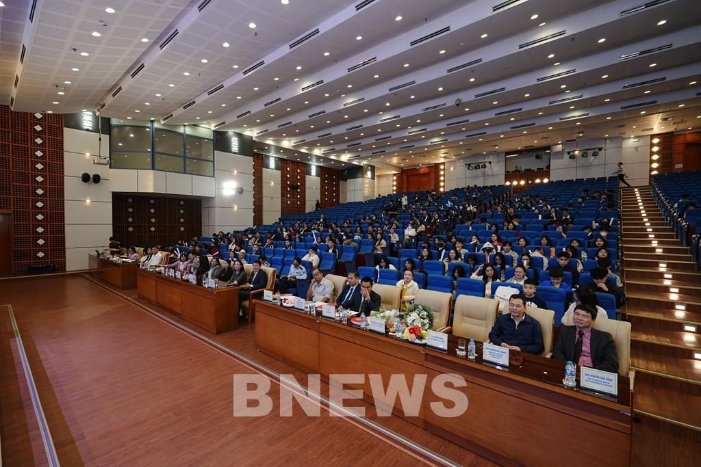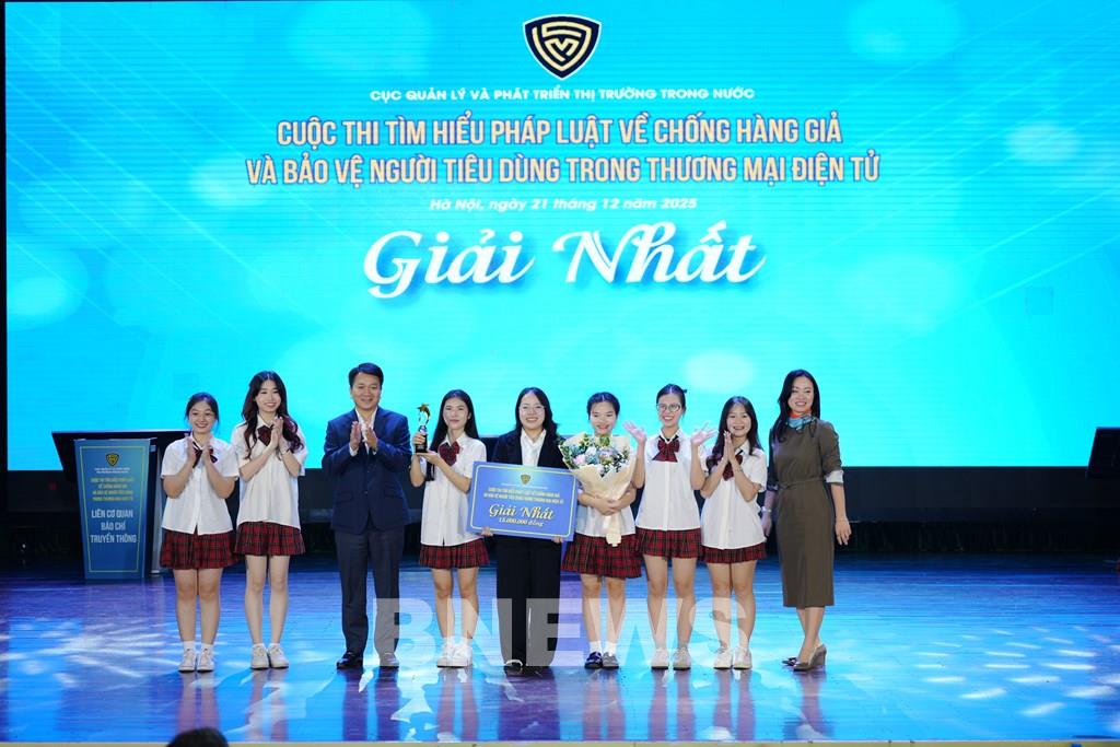 Ban tổ chức trao giải Nhất cho Đội Đại học Kinh tế quốc dân. Ảnh: Uyên Hương/ Bnews/vnanet.vn