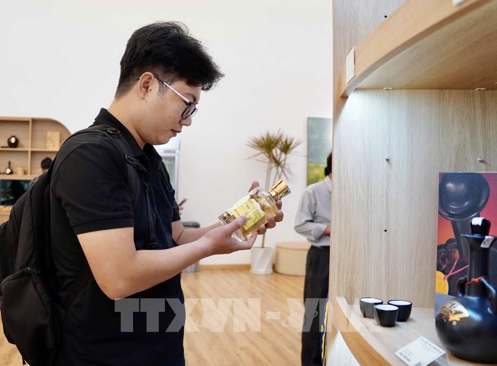 Sinh viên tìm hiểu về sản phẩm mới của Công ty CP Rượu Phú Lễ. Ảnh: Mỹ Phương - TTXVN