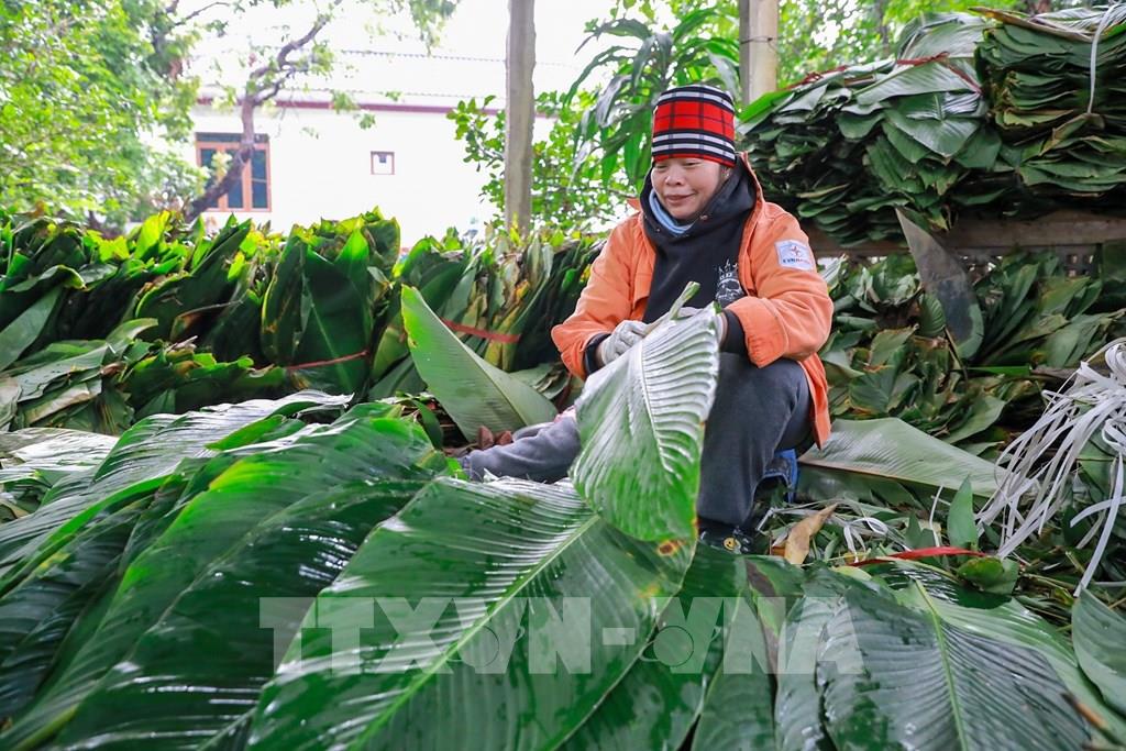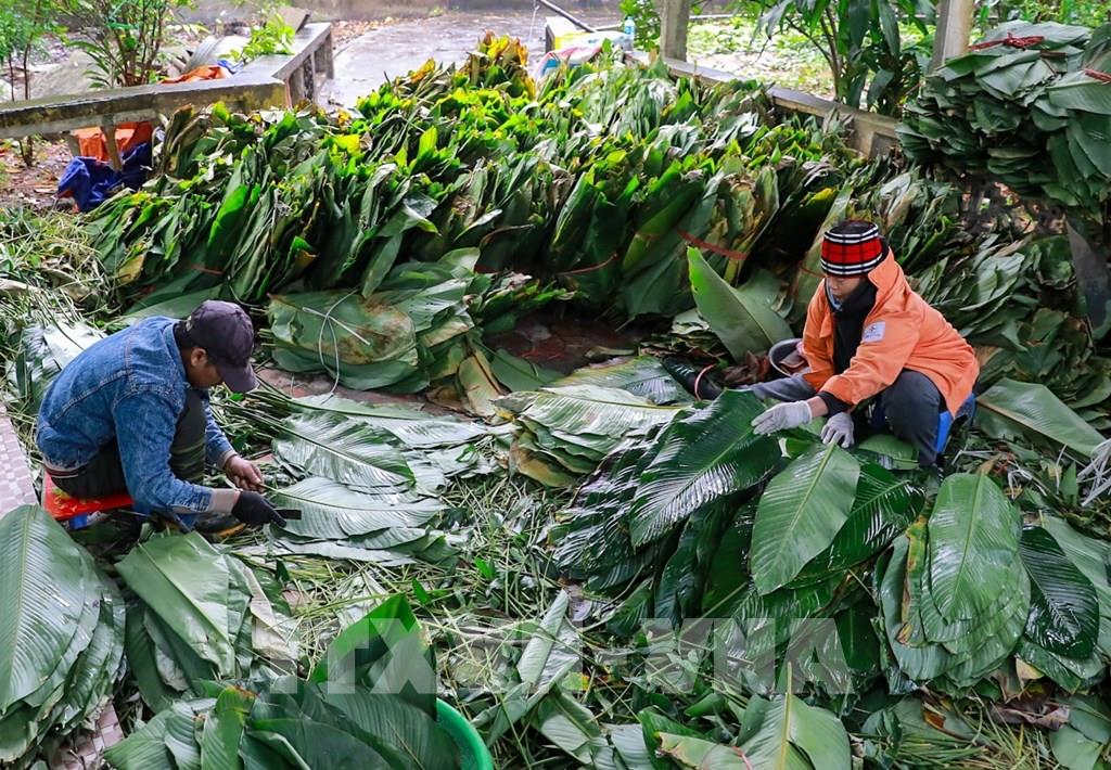 Những bó lá dong xanh mướt được lựa chọn kỹ lưỡng, rửa sạch và xếp ngay ngắn, sẵn sàng cho công đoạn gói bánh. Ảnh: Khánh Hoà - TTXVN