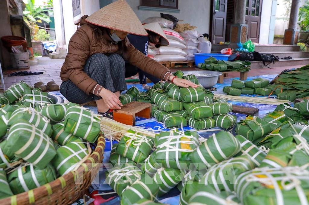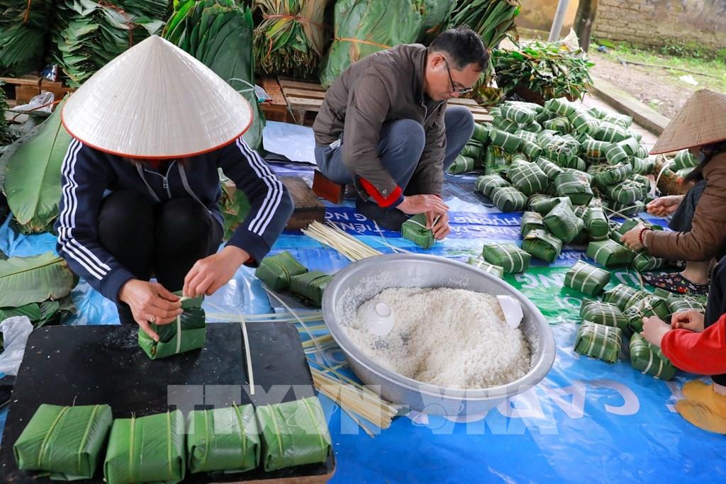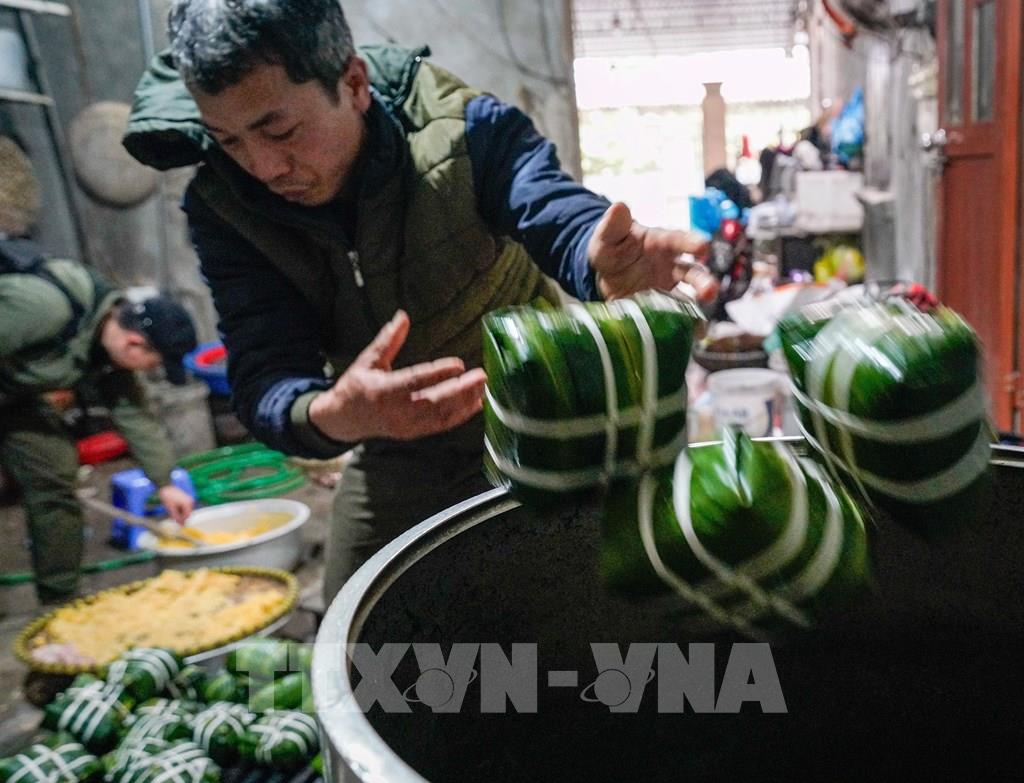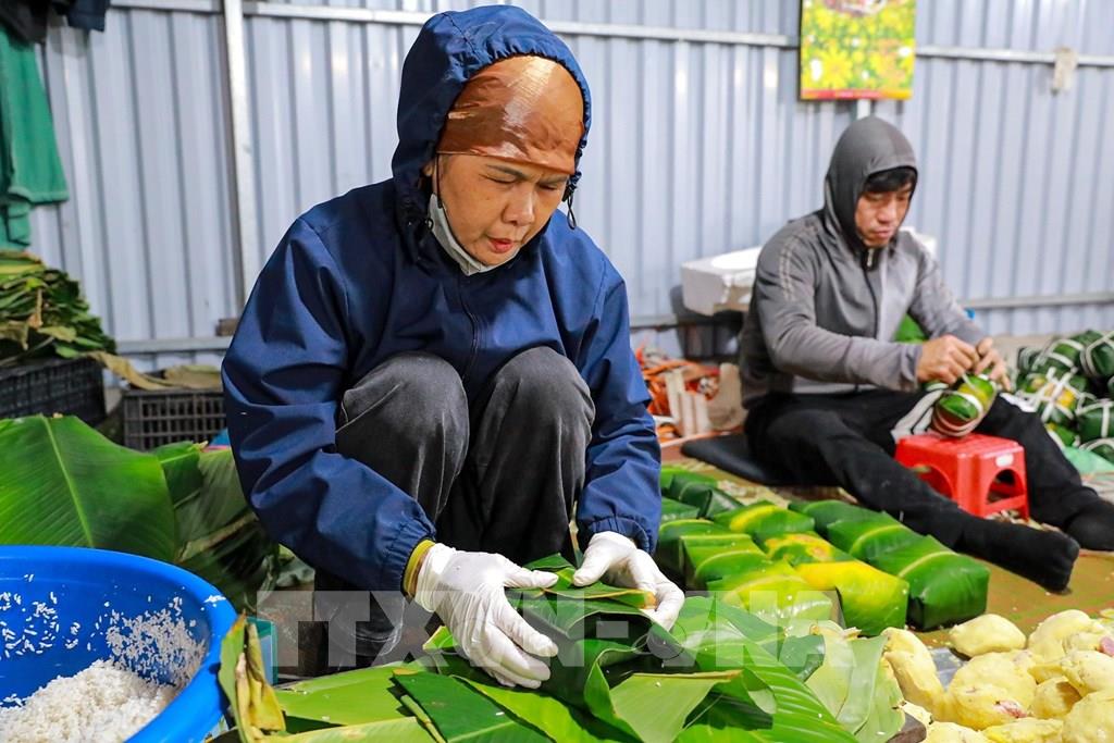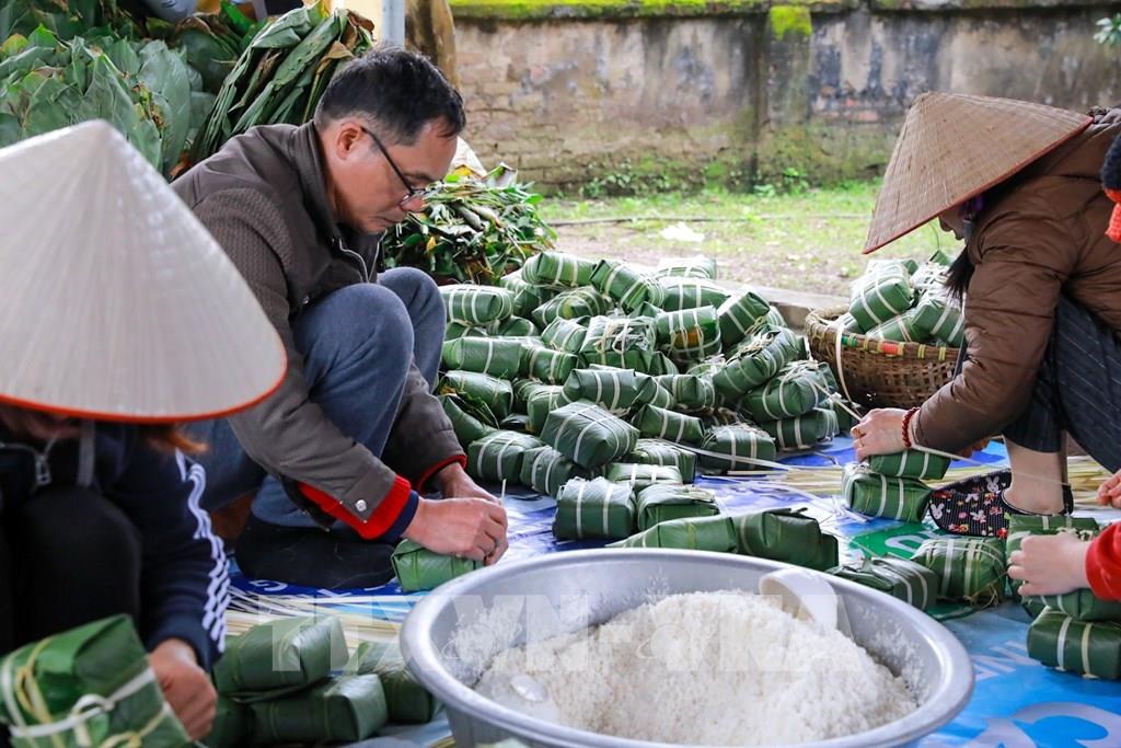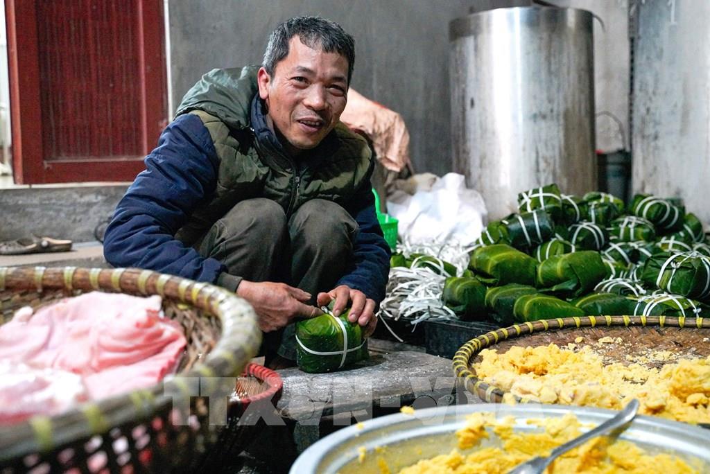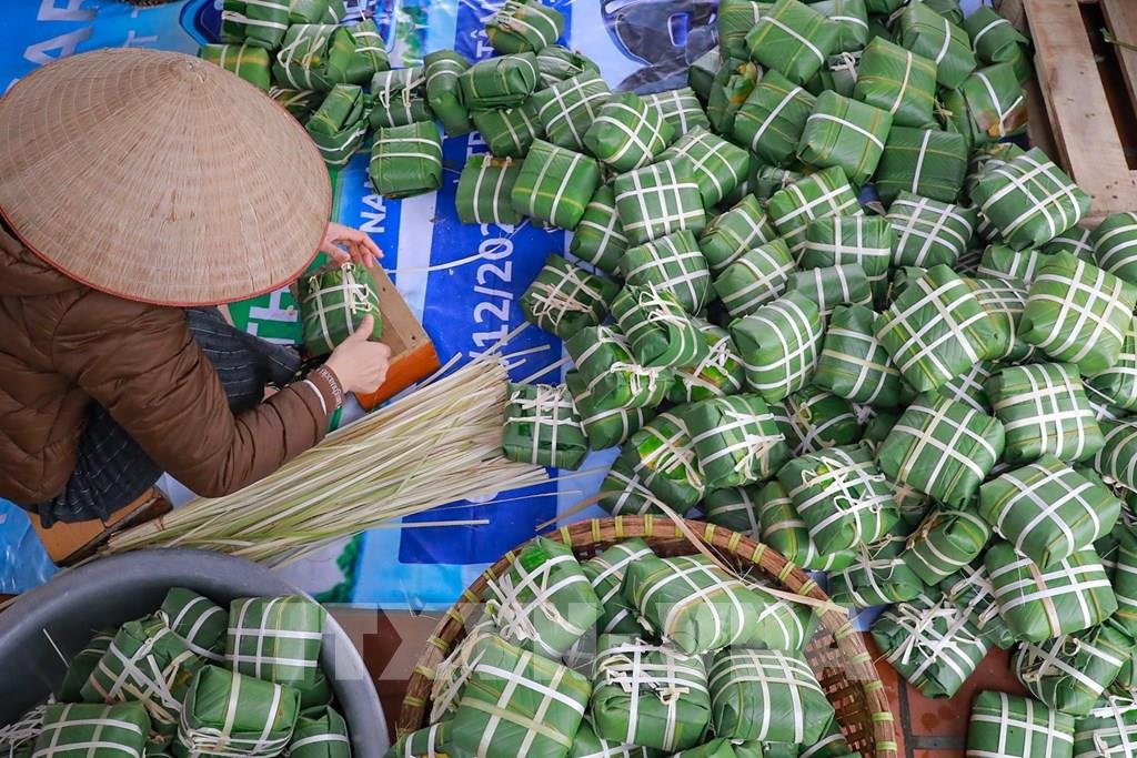 Không khí lao động khẩn trương hòa quyện cùng hương thơm của gạo nếp, đỗ xanh, thịt lợn, lá dong, tạo nên bức tranh Tết đậm đà bản sắc.