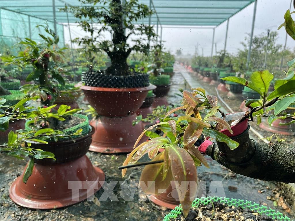 Một vườn mai bonsai tại xã Tân Tây được lắp hệ thống tưới nước tự động. Ảnh: Đức Hạnh - TTXVN