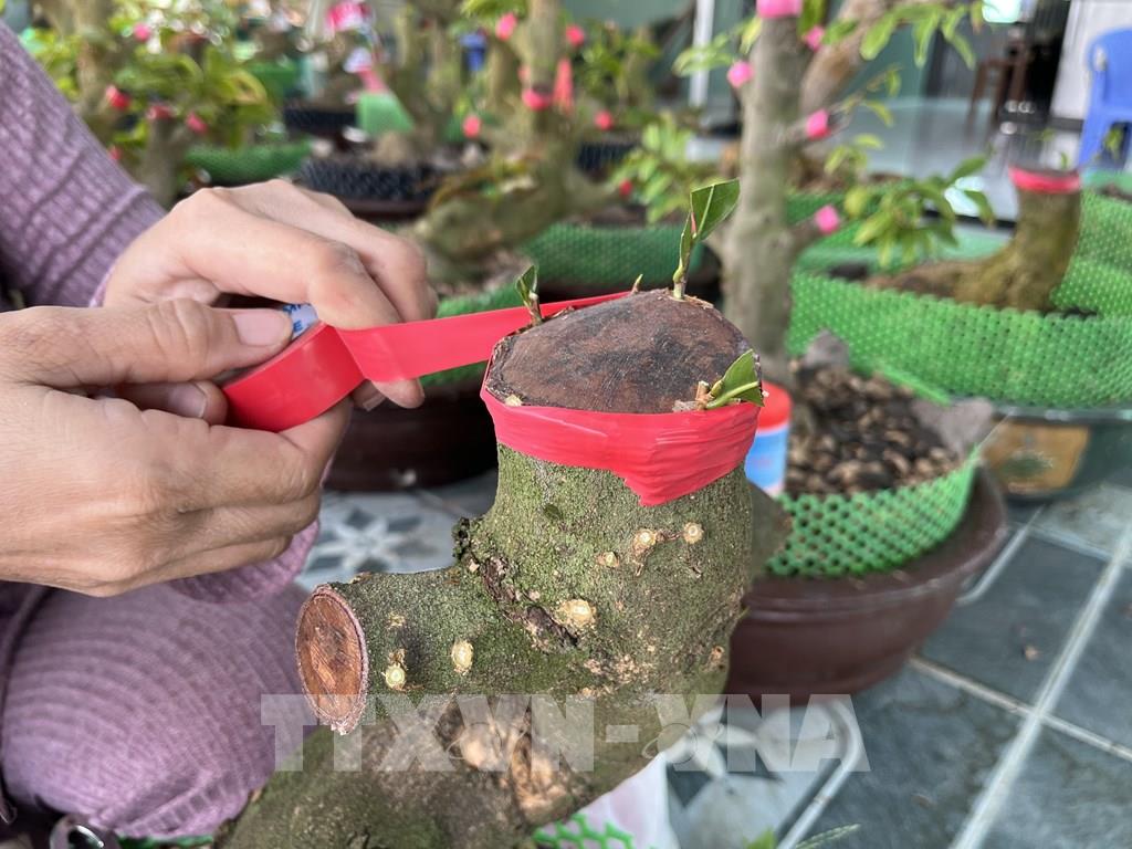 Công đoạn ghép để cho ra cây mai vàng gốc to, đẹp, hoa nhiều cánh. Ảnh: Đức Hạnh - TTXVN