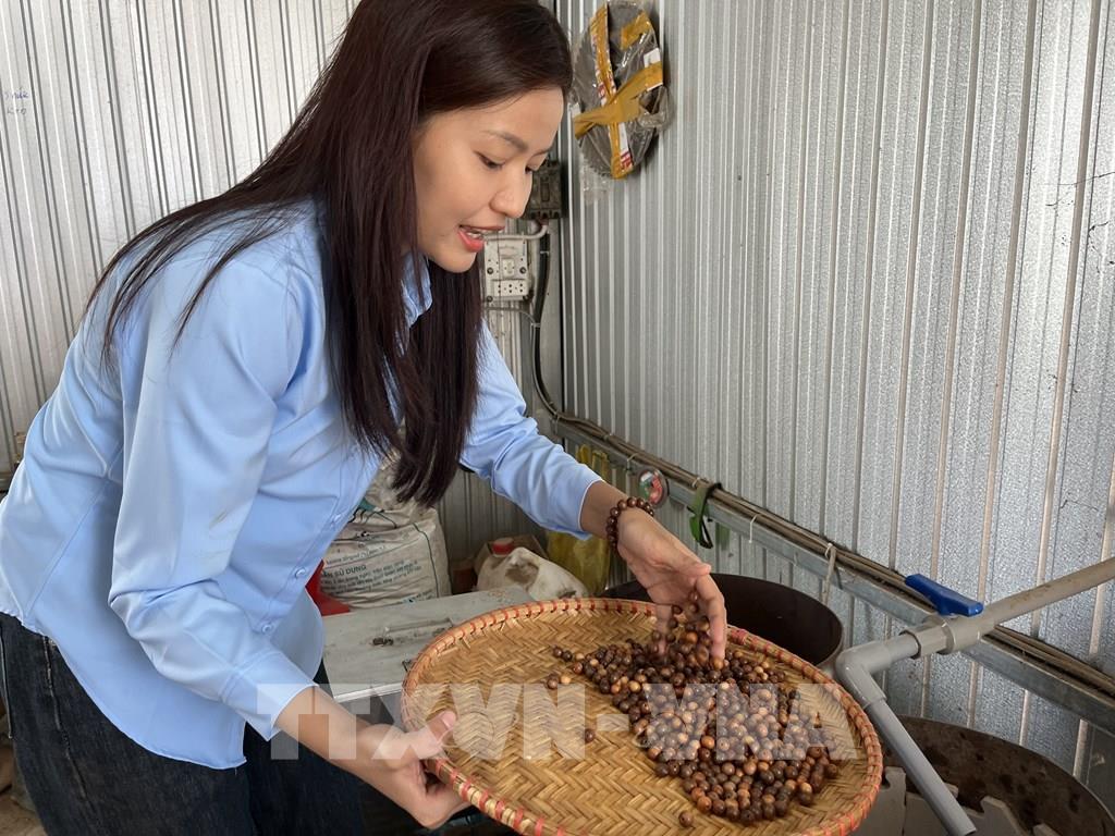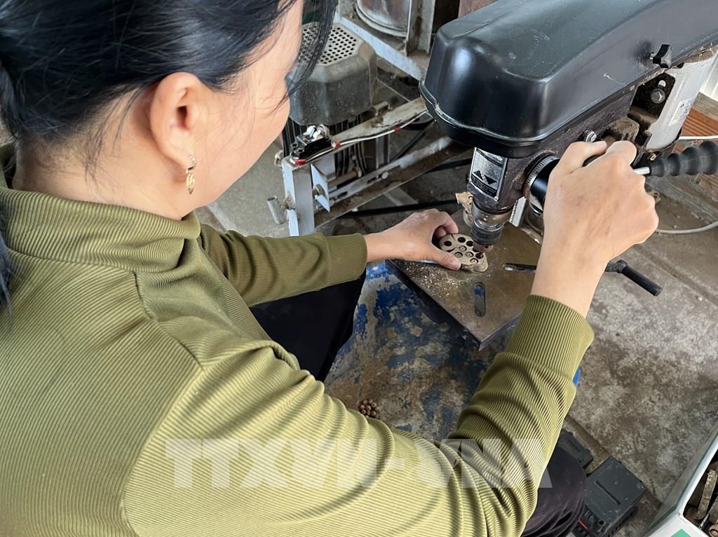 Chị Nguyễn Thị Kiều Trang là người đầu tiên tại ấp Mai Vàng nghĩ ra và hoàn thiện quy trình sản xuất các sản phẩm thủ công từ gỗ thân cây mai vàng. Ảnh: Đức Hạnh - TTXVN